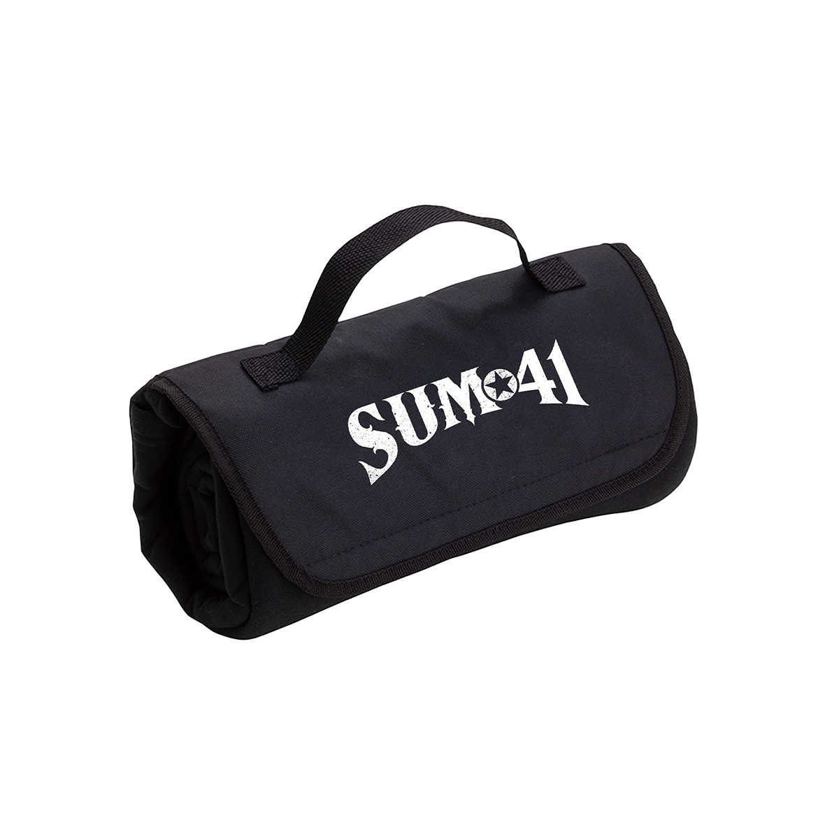 Black roll up picnic blanket featuring a printed Sum41 logo.
